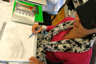 Since I've been talking with my students about not being a slave to their photograph that they're working from, and because I want everyone to connect more with what they're doing, I thought it would be an interesting exercise to have my students wear a blindfold and draw an object through sheer touch. I told them that they are so much more creative than they realize and they were about to experience it first hand!